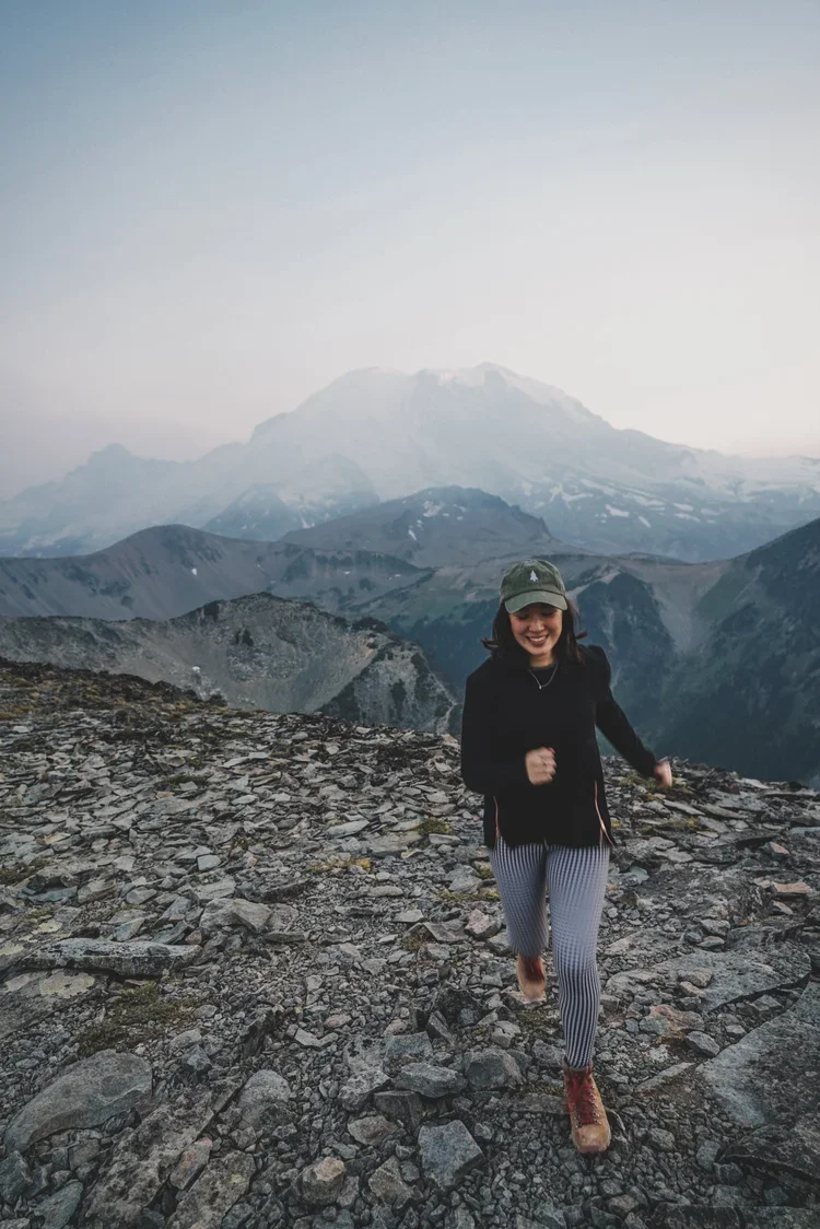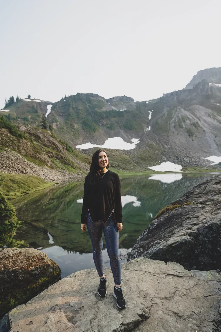 Two women sitting on a wooden dock by the water, smiling and holding cans of wine, with a lake and forested mountains in the background.