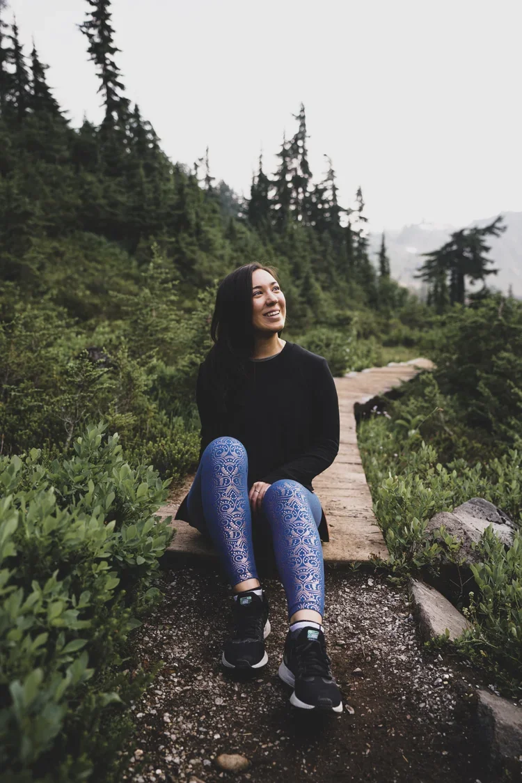 Two people wearing socks, one orange and one gray, are relaxing on a wooden dock by a lake with mountains and cloudy sky in the background.