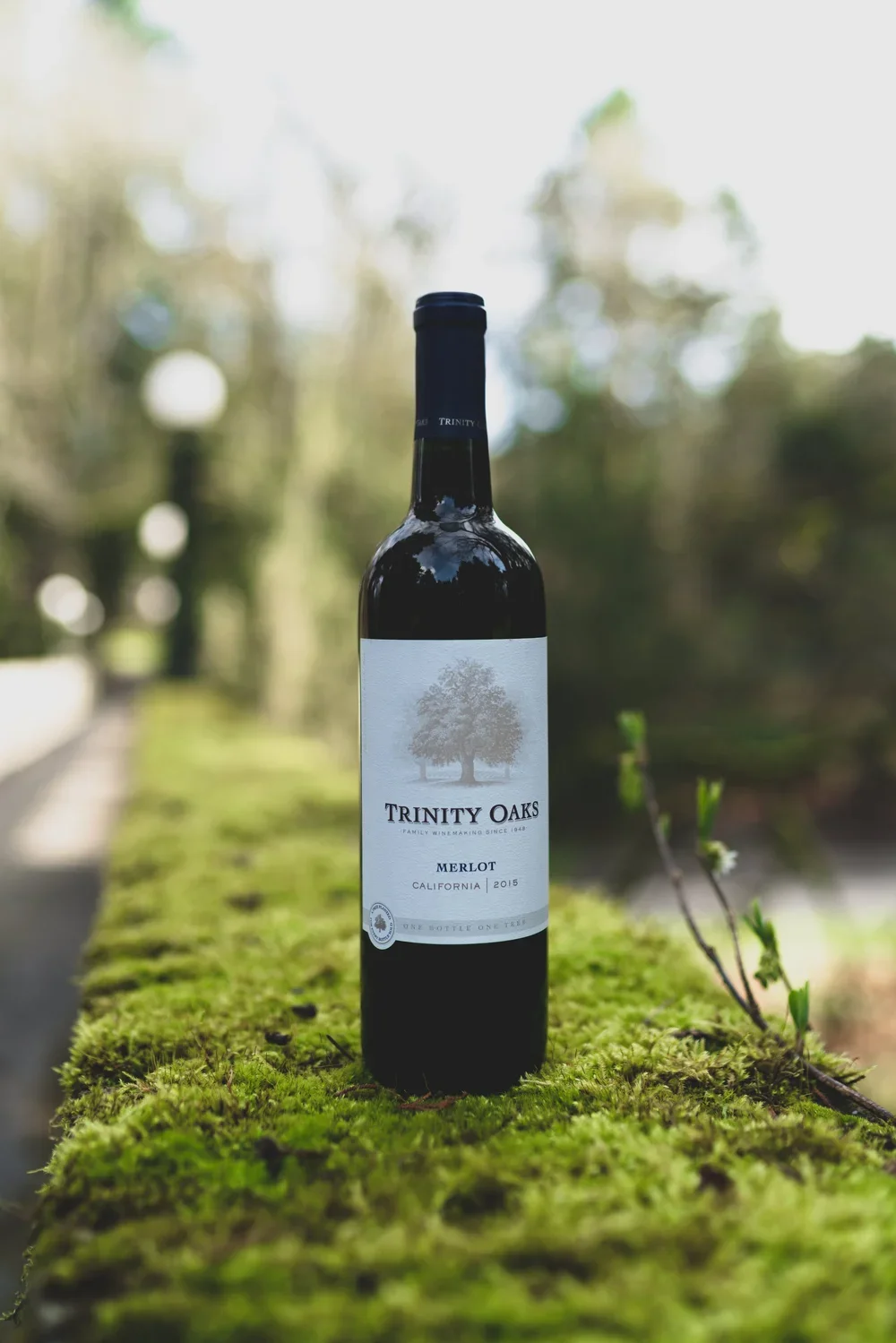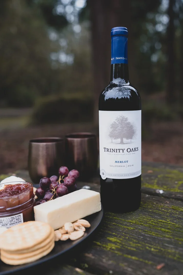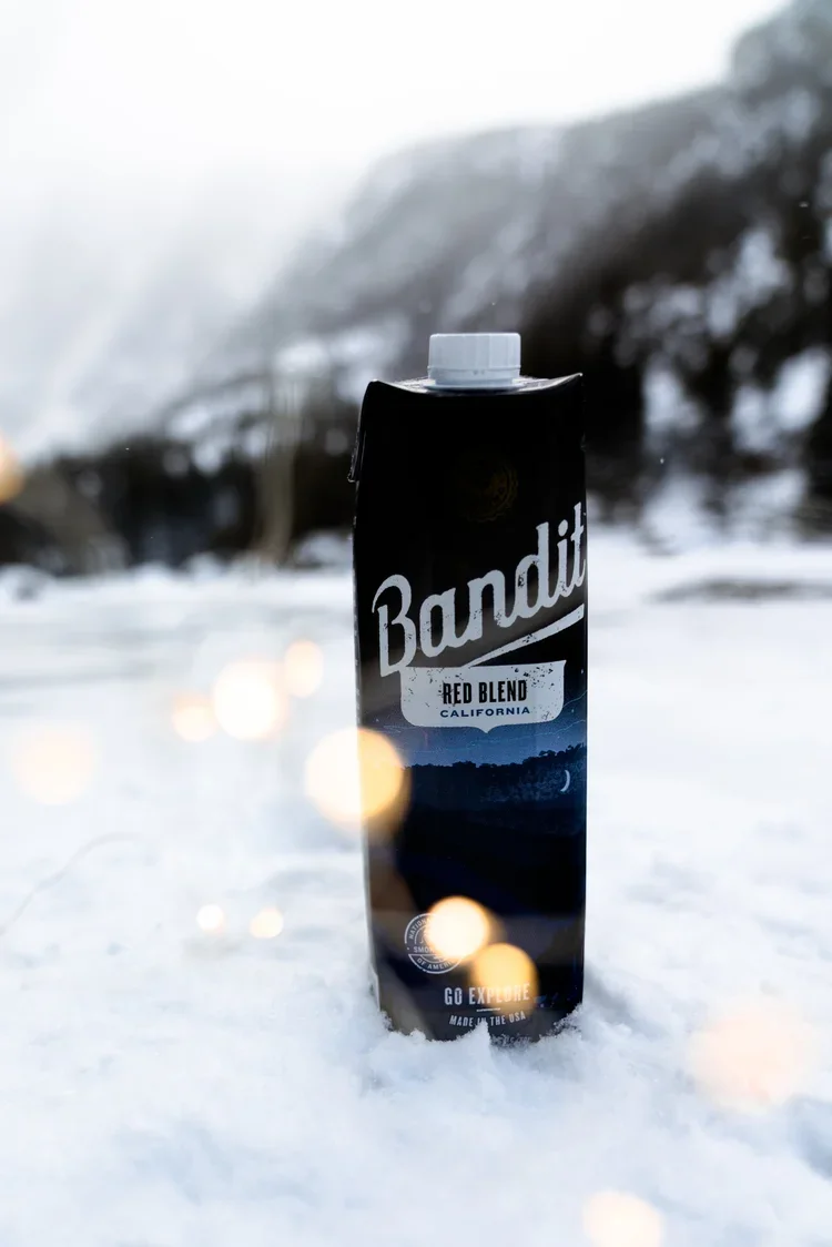 A person in a blue jacket holding a carton of boxed Merlot wine on a snowy surface with mountains in the background.