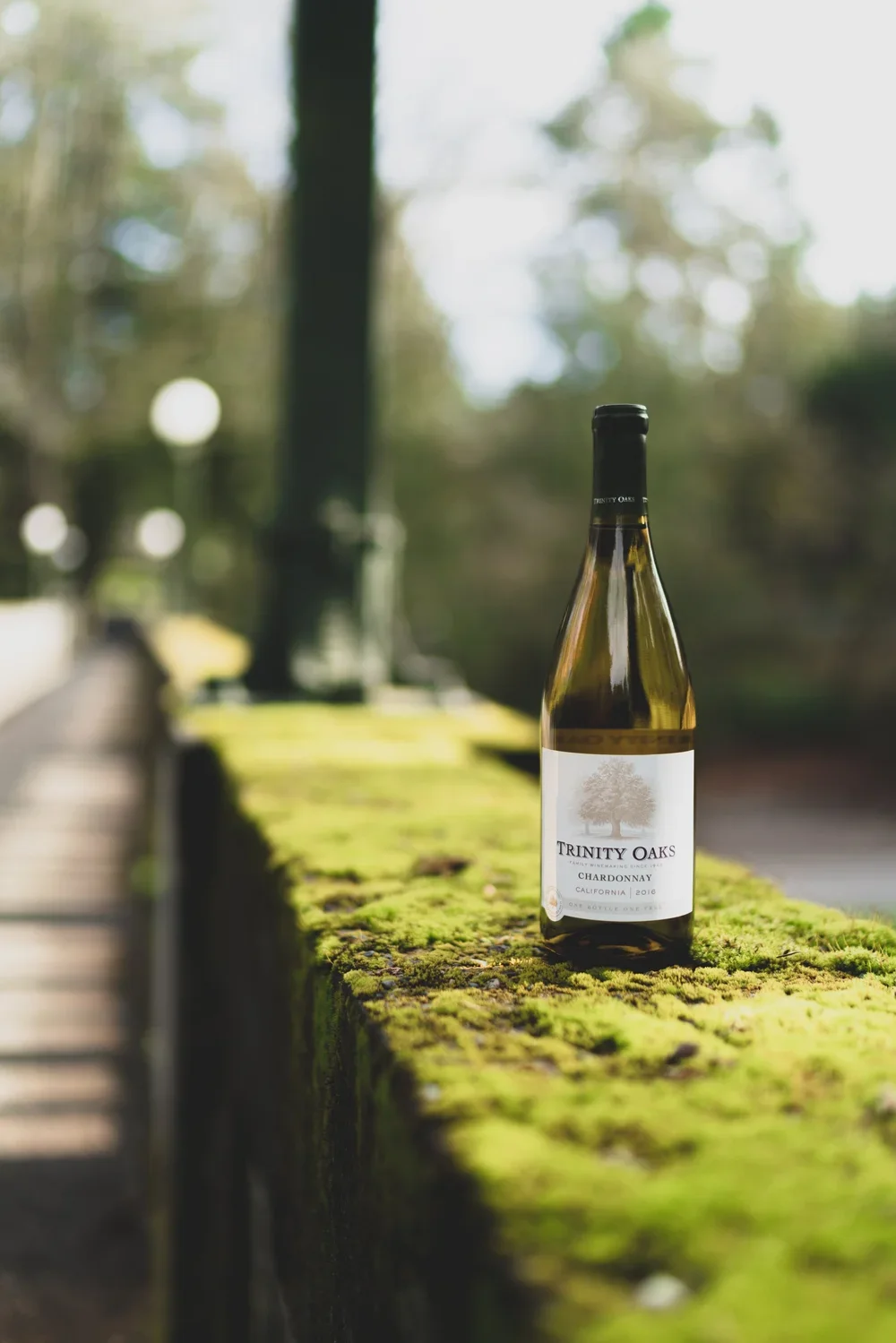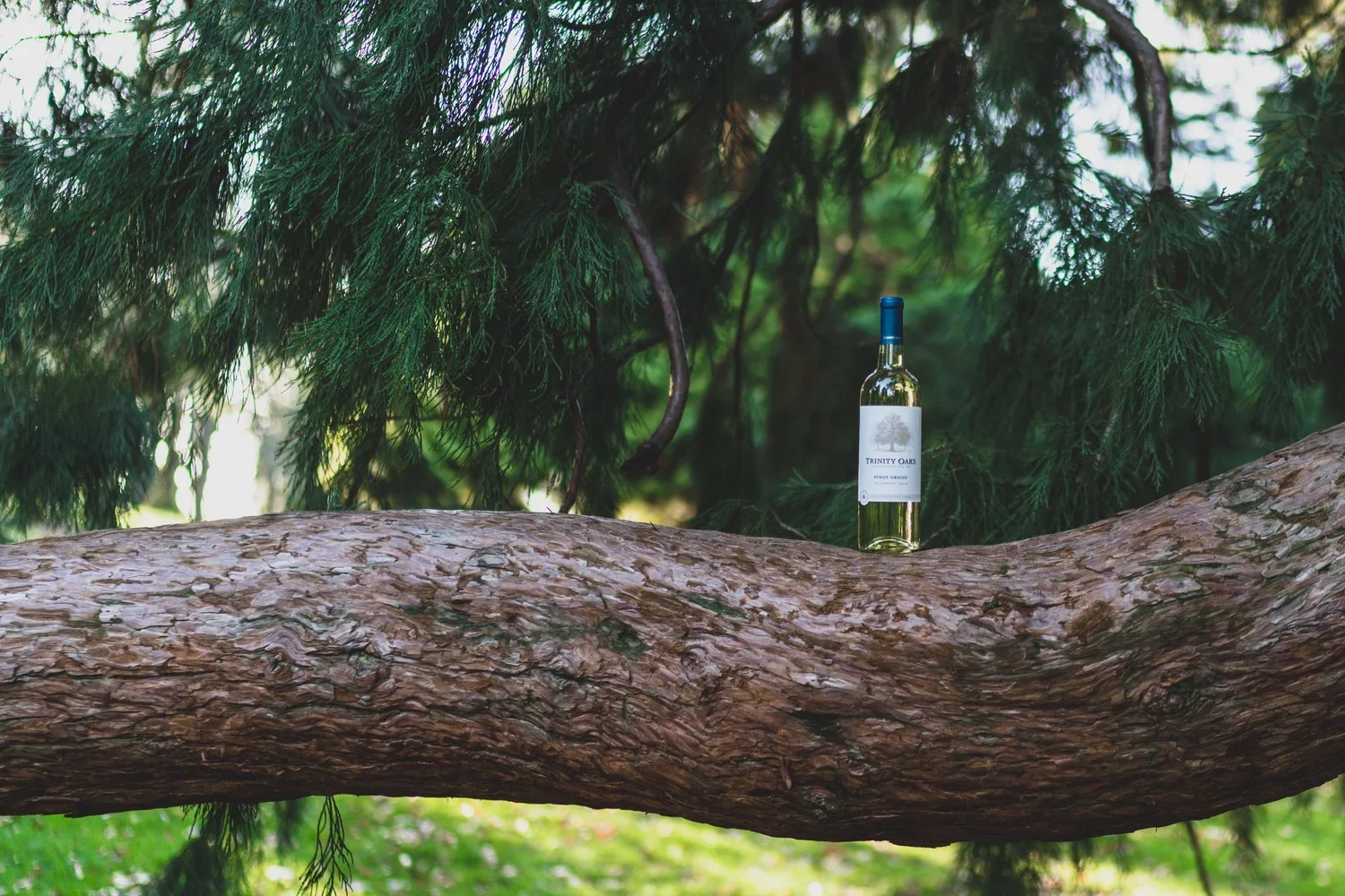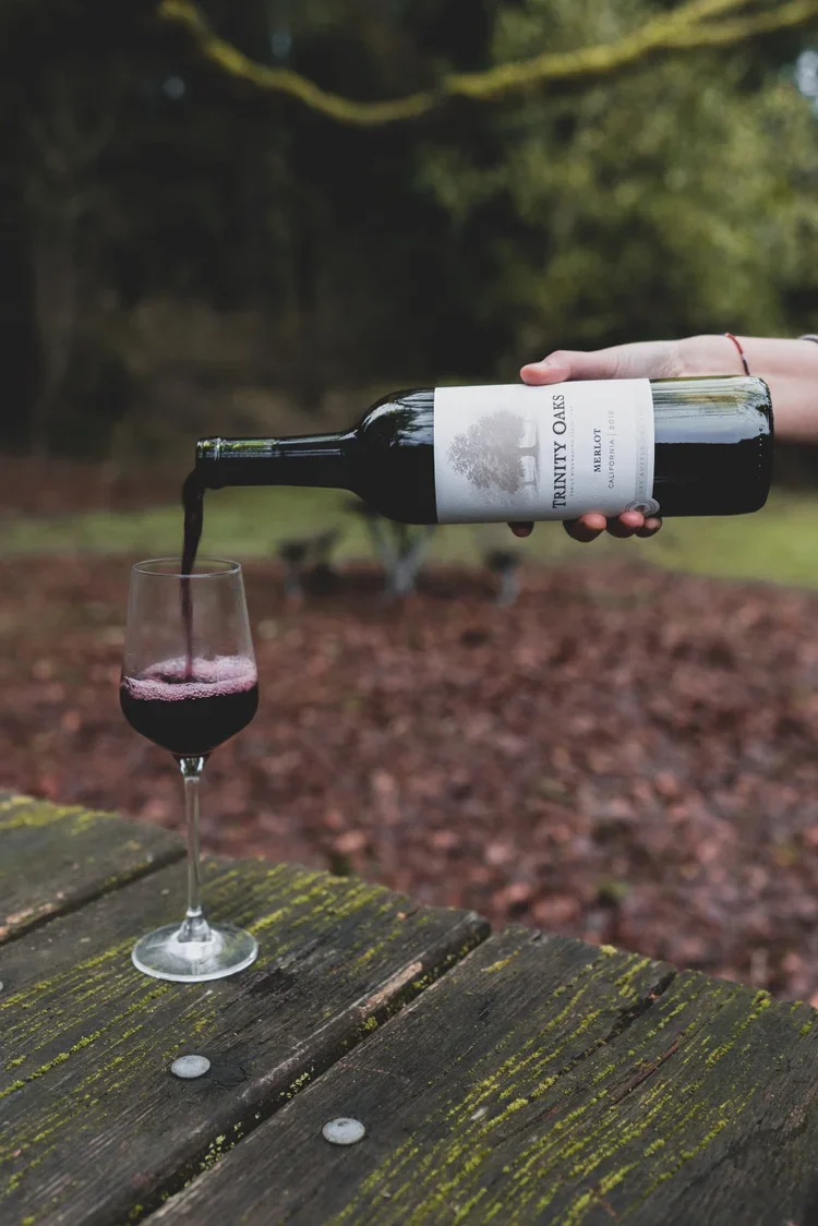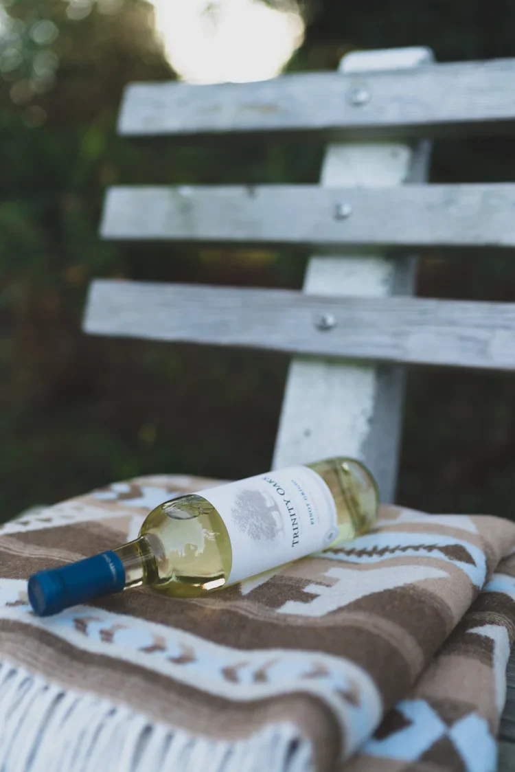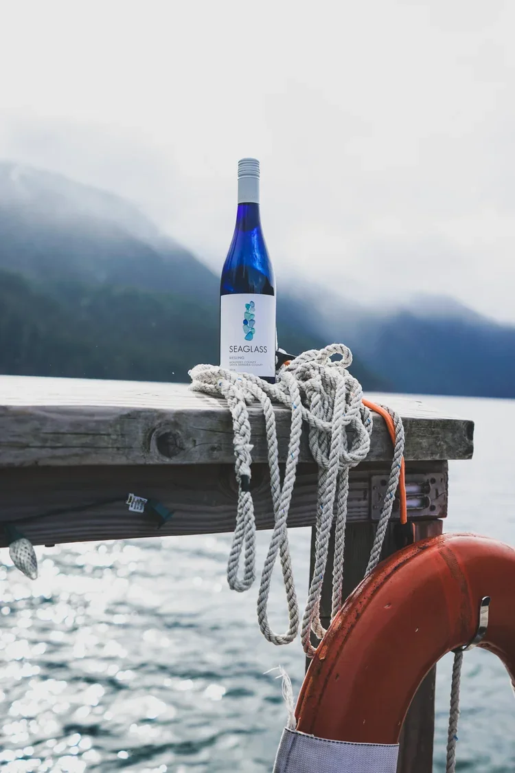 Person sitting on a wooden dock by the water, holding a bottle of Riesling wine, wearing white sneakers, blue jeans, and a black jacket, with a life preserver nearby.