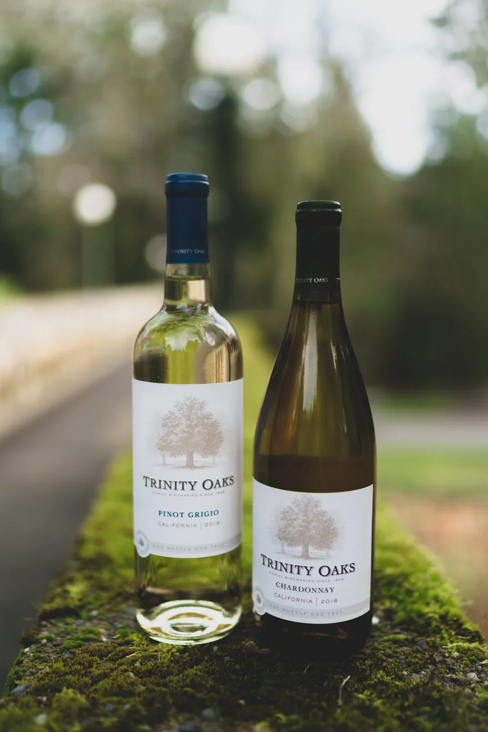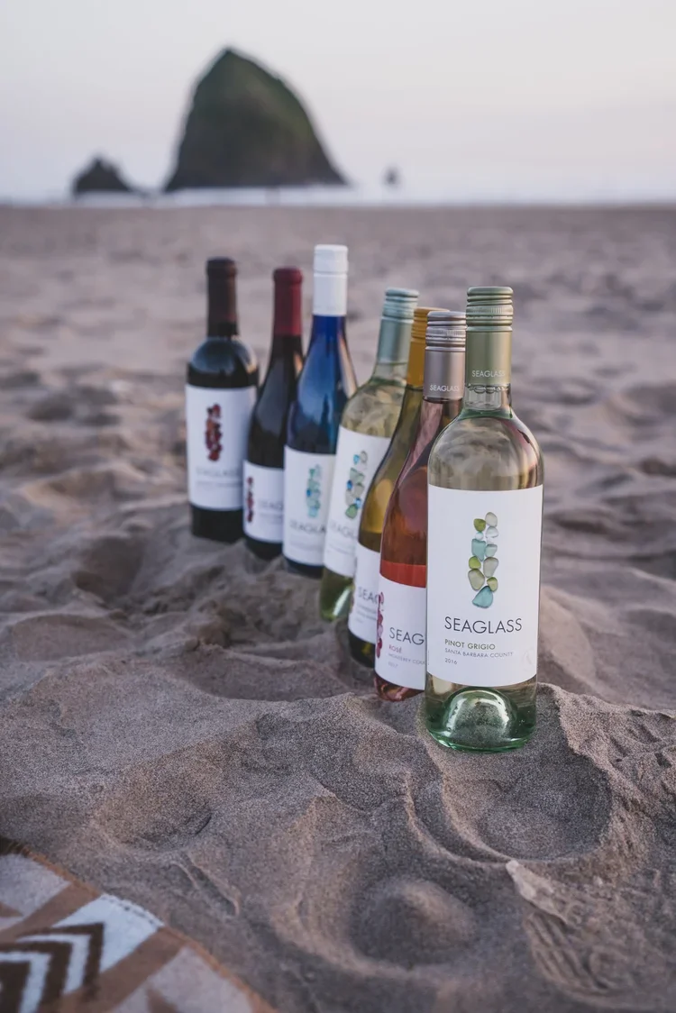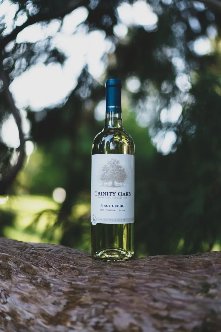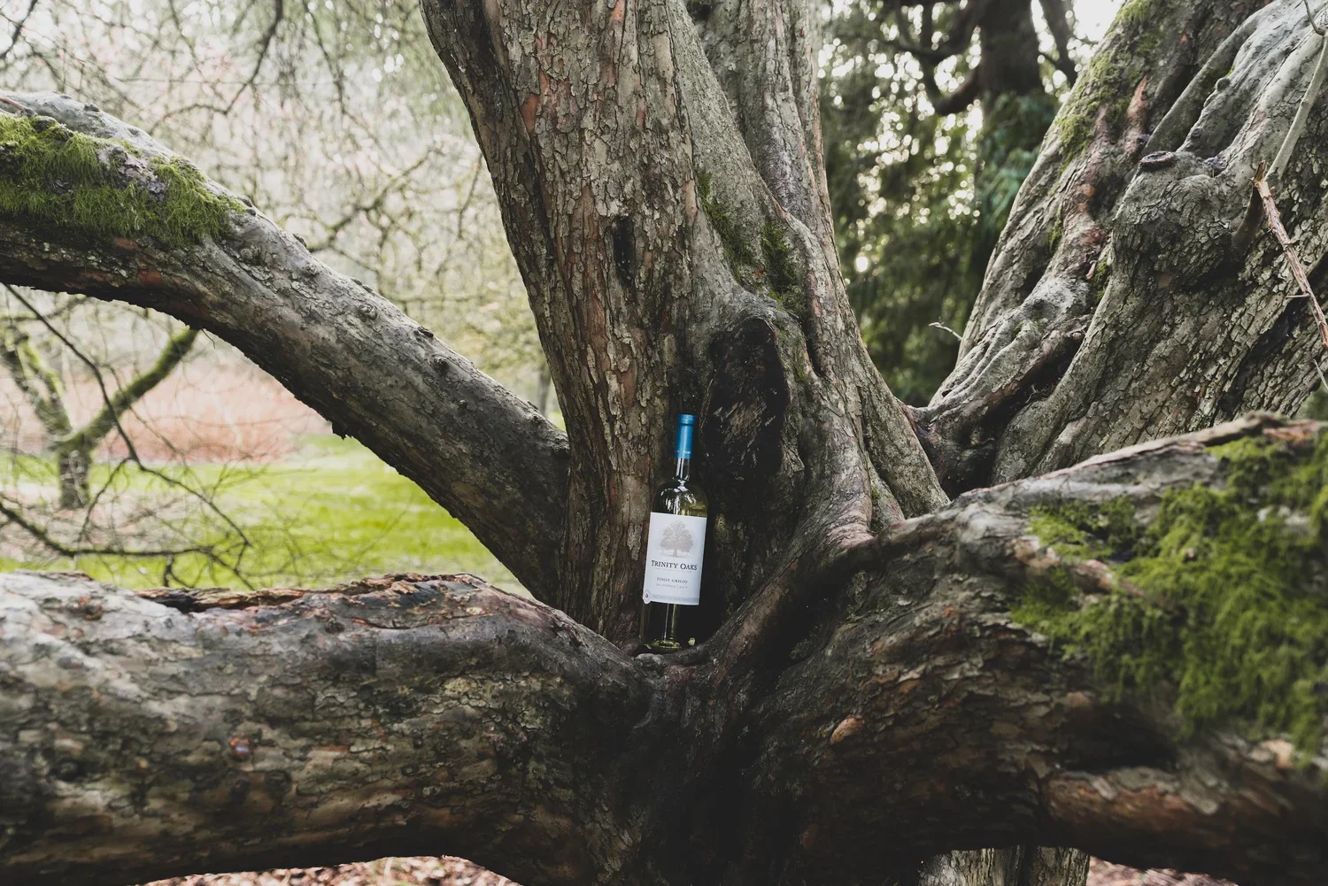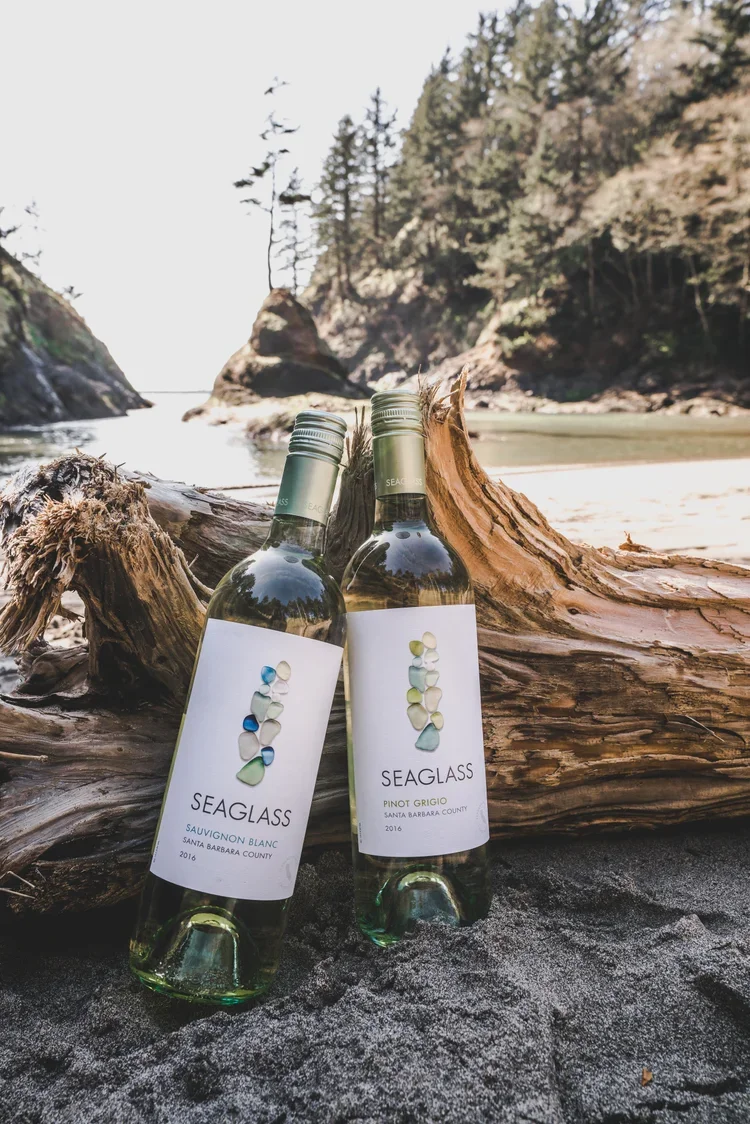 Person sitting on a wooden dock by the water, holding a bottle of Riesling wine, wearing white sneakers, blue jeans, and a black jacket, with a life preserver nearby.