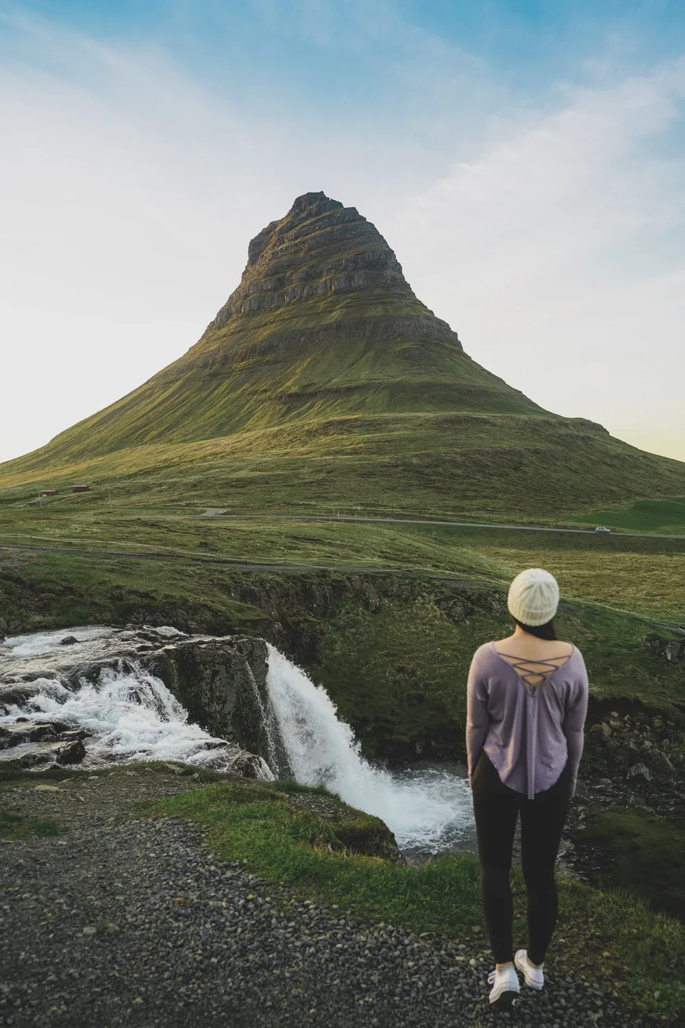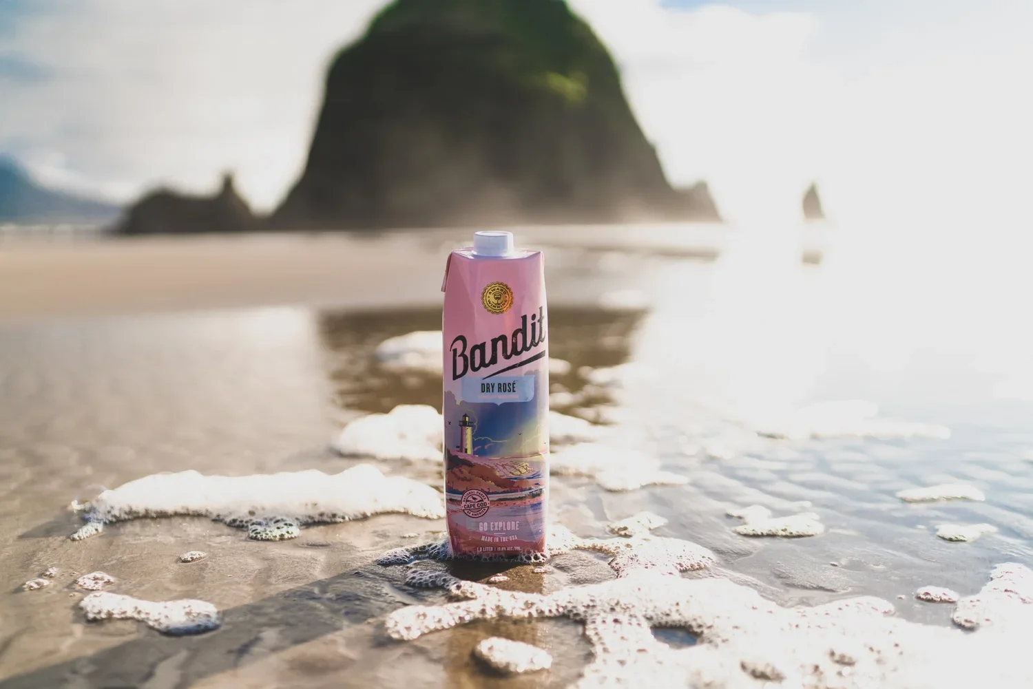 Person holding a can of wine near a scenic view of a river or lake with mountains in the background.